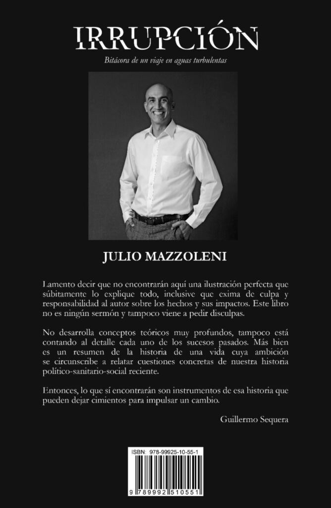 Diseño editorial IRRUPCIÓN. Bitácora de un viaje en aguas turbulentas. El libro del exministro de Salud Pública Julio Mazzoleni con prólogo del Dr. Guillermo Sequera. Prev